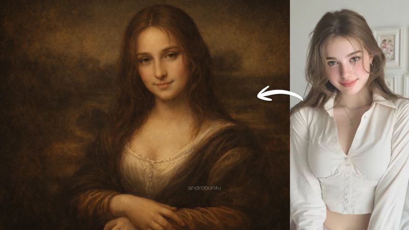 Bayangkan ulang potret ini dalam gaya lukisan klasik era renaisan. Gunakan gaya lukisan ala Leonardo da Vinci saat ia melukis Monalisa. Pose dan ekspresi wajah objek pastikan sama persis dengan Monalisa. Berikan tekstur cat minyak realistis pada warna kulit, dan render latar belakang dalam warna cokelat dan hitam yang dalam, hangat, dan redup.